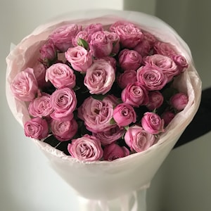 Стильный букет из пионовидных кустовых роз Бомбастик. Идеален как подарок для самой утончённой женщины — той, что любит романтику, стиль и внимание к деталям.
