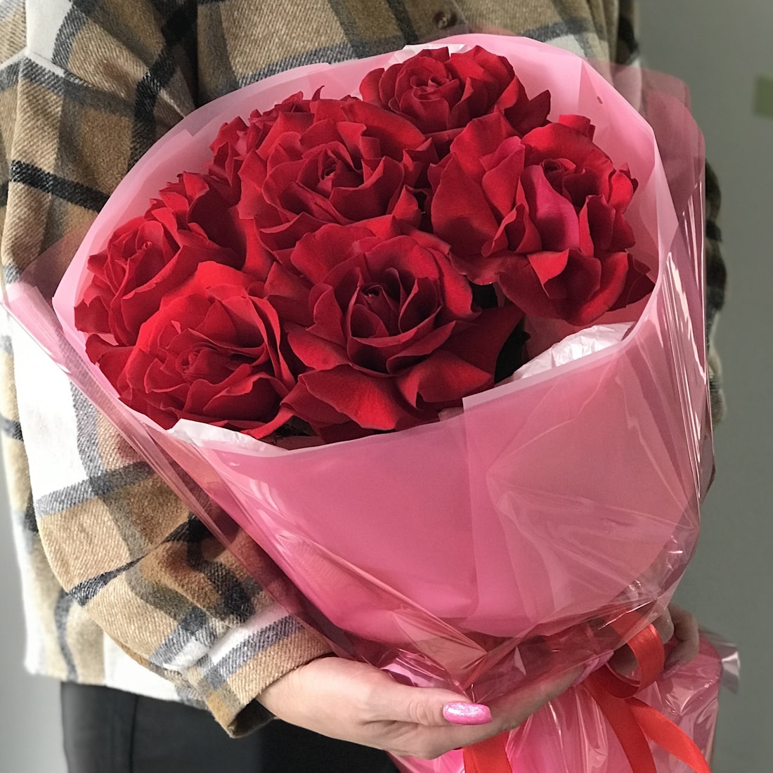 Букет из 7 красных французских роз «Фридом» впечатляет с первого взгляда.