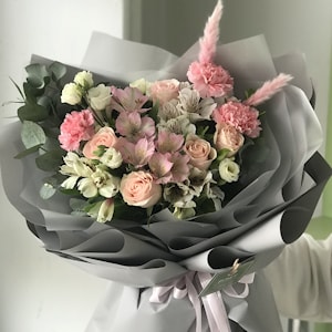 Этот букет — как лёгкое дыхание теплого утра, наполненного цветами и светом. В нём переплетаются нежность и энергия: бархатистые розы дарят романтику, диантусы (гвоздики) придают фактурности и глубины, а воздушные альстромерии вносят нотку спонтанной радости и живости.