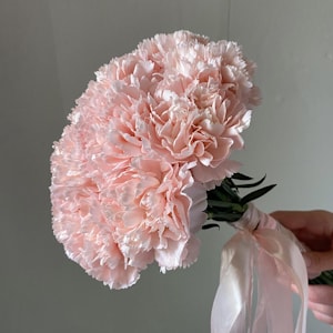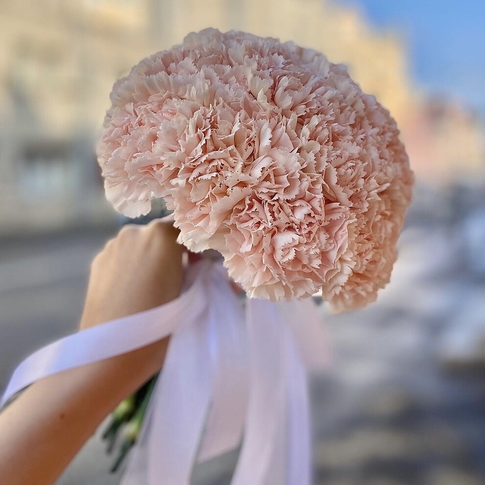 Каждая гвоздика бережно отобрана и аккуратно оформлена, чтобы создать элегантную композицию, которая дополнит как классическое, так и современное свадебное платье.