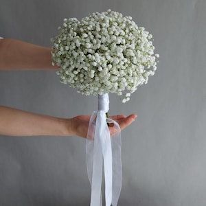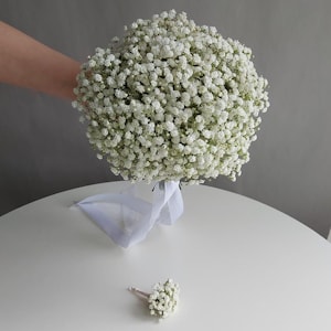 Тысячи крошечных цветков, словно облако, окутывают образ невесты невесомой дымкой. Этот букет идеально подойдёт для утончённой, романтичной девушки, мечтающей о воздушной и чувственной свадьбе.