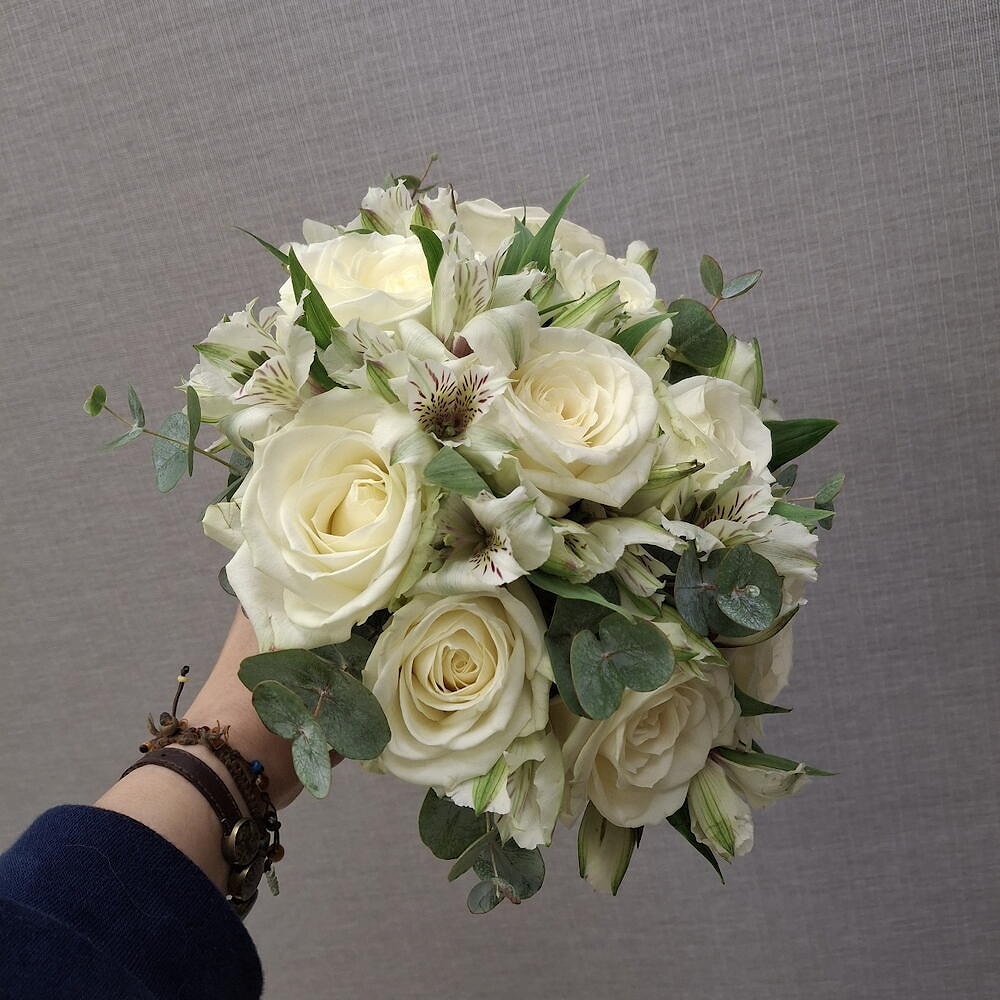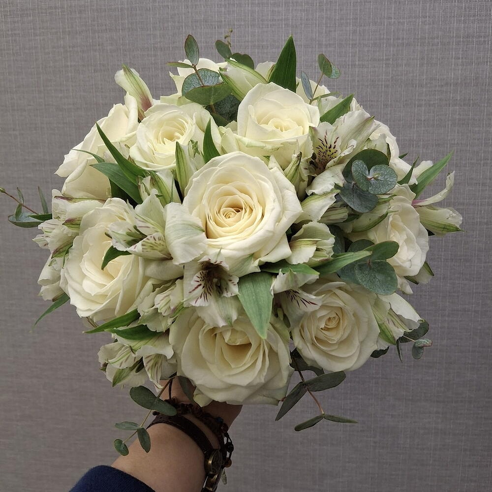 Элегантный свадебный букет, созданный из утончённых белых роз и воздушных альстромерий, символизирует чистоту, искренность и светлые чувства. Гармоничное сочетание классики и лёгкости делает его идеальным выбором для романтичной невесты, стремящейся к изяществу и нежности в каждом штрихе своего образа.
