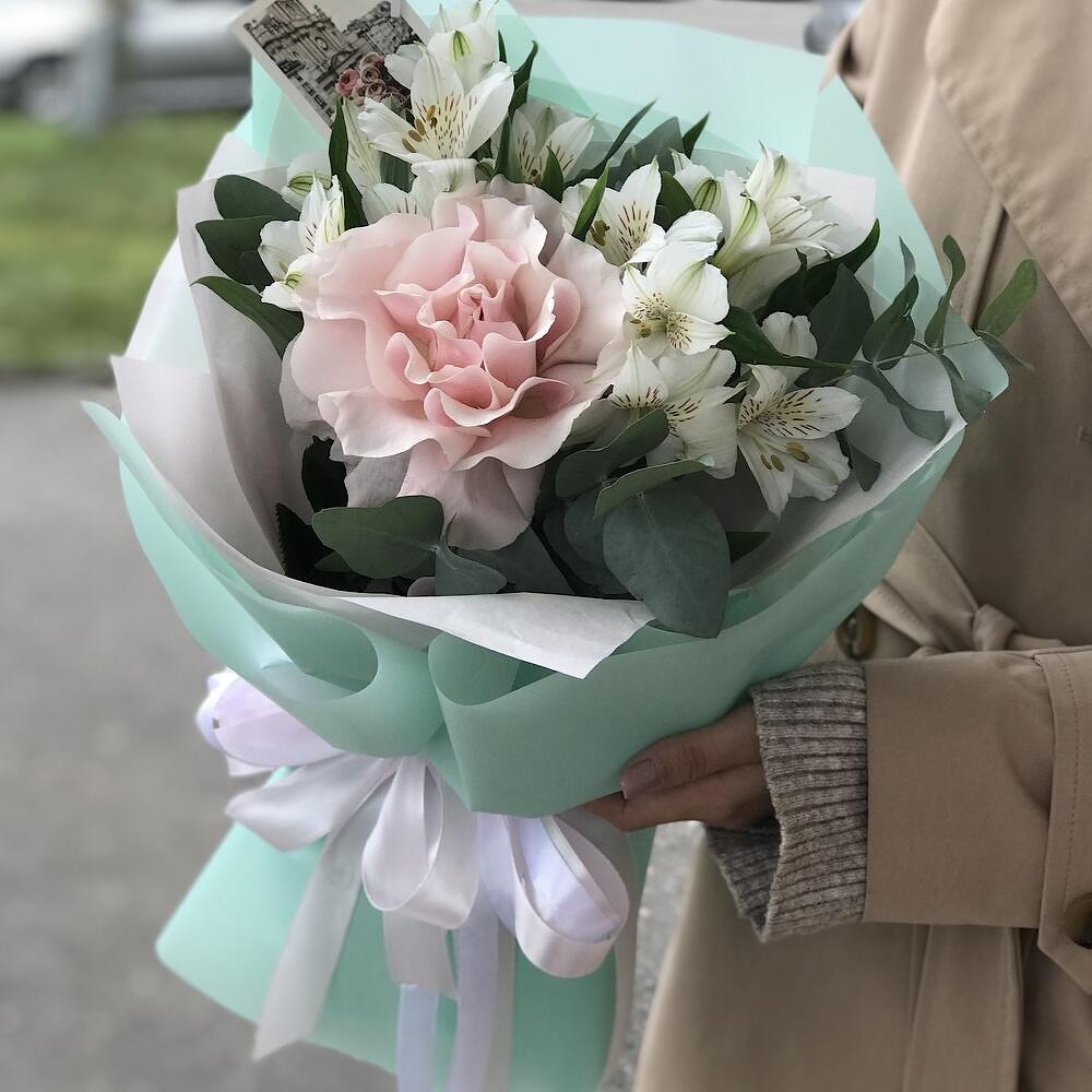 Букет «Один бирюзовый француз» — это нежность и стиль в каждом лепестке. Изысканная розовая французская роза сочетается с утончёнными белыми альстромериями, а свежий эвкалипт добавляет лёгкости и современного шарма. Бирюзовая упаковка делает композицию особенно элегантной, превращая её в настоящий акцент внимания.