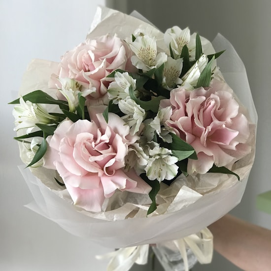 Состав букета: 3 французских розовых розы, 4 альстромерии.