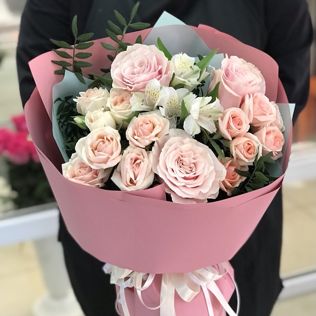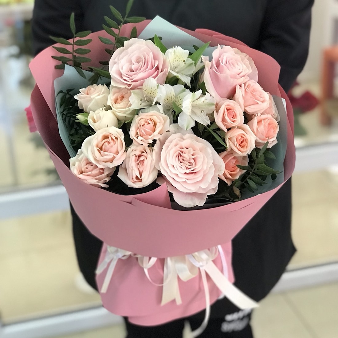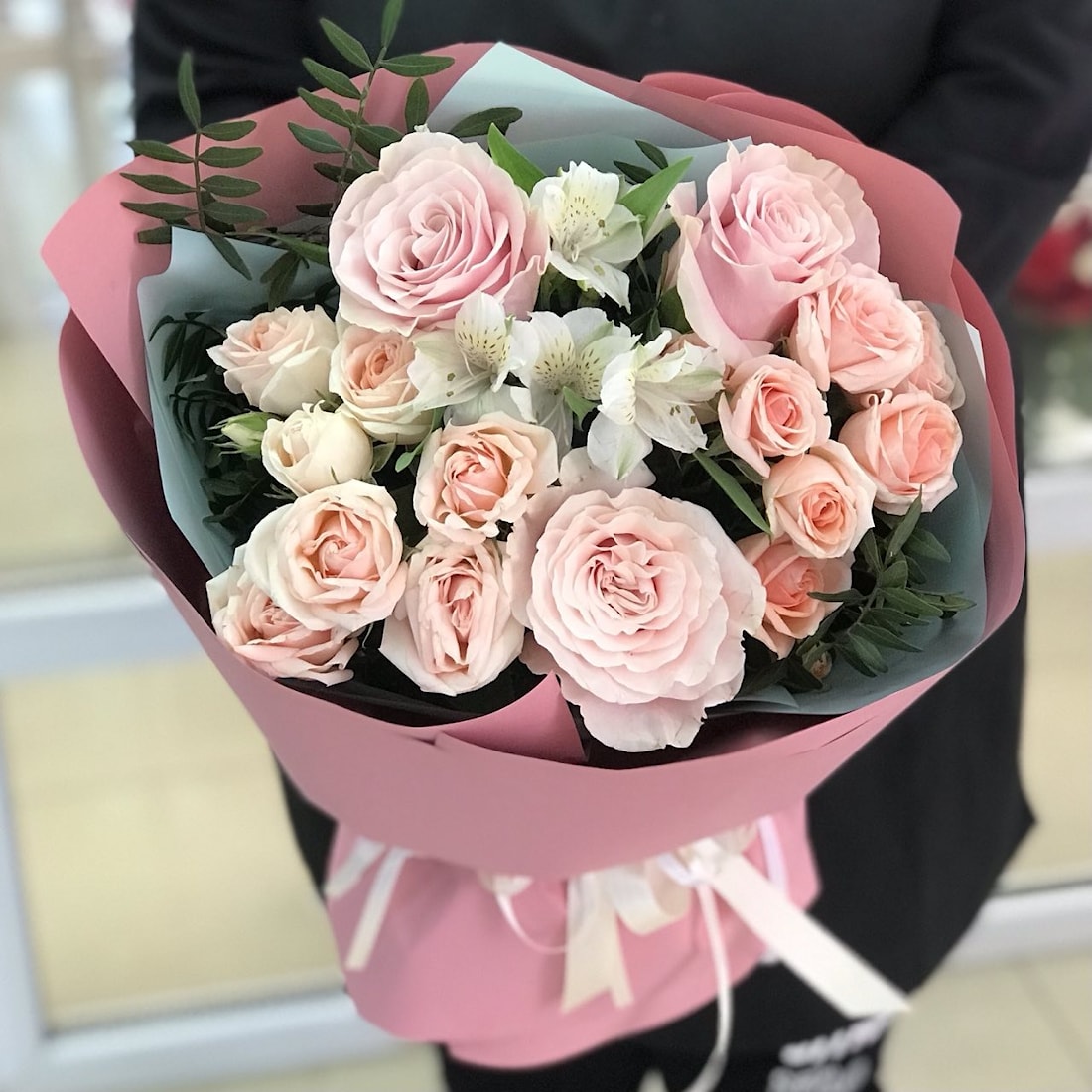 • Писташка: Зеленые листья писташки обрамляют букет, подчеркивая его естественную красоту и свежесть.