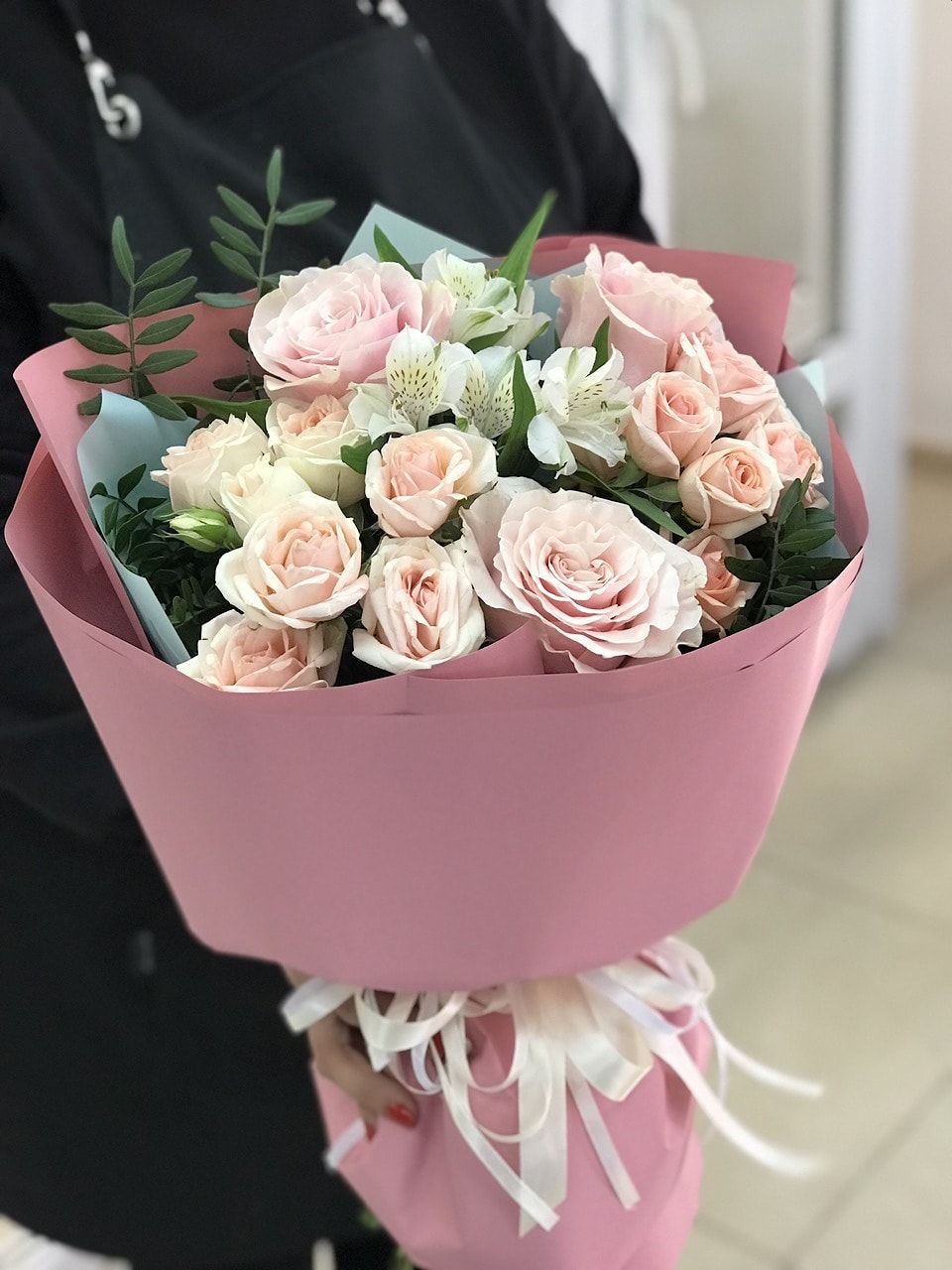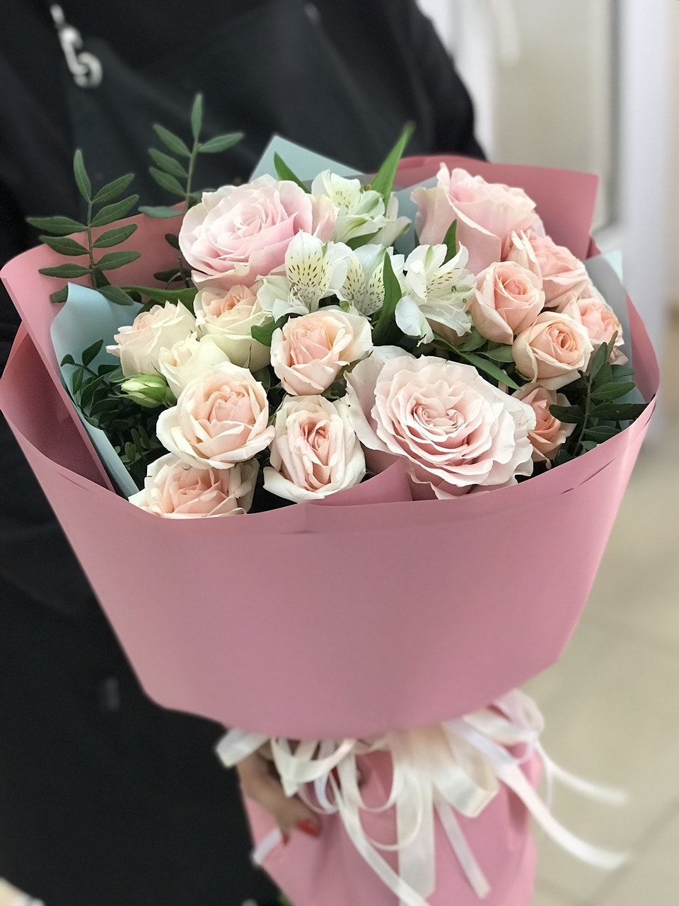 2. Акция! Букет «ТОП» - 3 французские розы, 3 кустовые розы 1 альстромерия 🔥 Хит 2026 года! Новый тренд, свежий стиль. Этот букет — идеальный вариант, если хочется вау-эффекта. Новая волна. Безупречный Букет 2026 года) Жми!