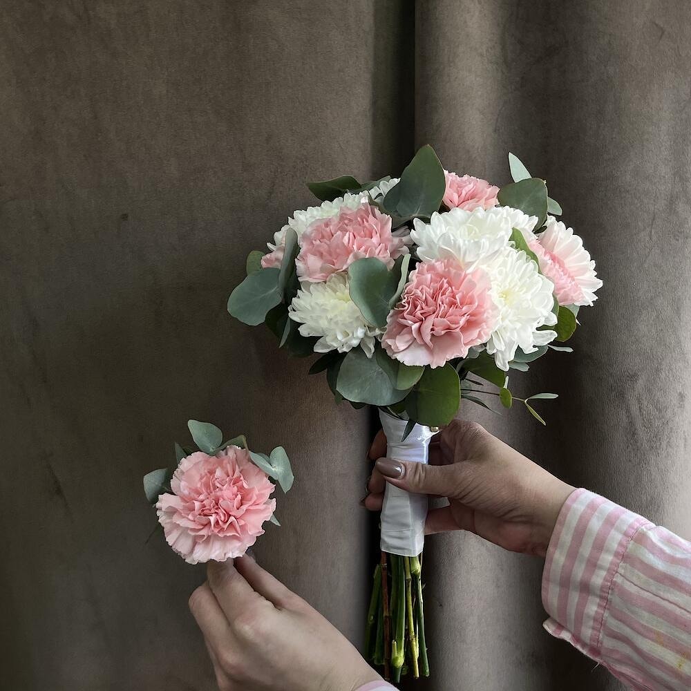Хризантемы придают букету воздушность и объем, а гвоздики добавляют изысканности и романтики. Эти цветы славятся своей стойкостью, поэтому букет сохранит свежесть на протяжении всего свадебного дня и останется таким же прекрасным на фото.