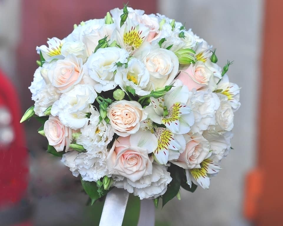 Состав свадебного букета невесты "Белый": роза 9 штук, роза кустовая 5 штук, эустома 5 штук, альстромерия 5 штук и зелень