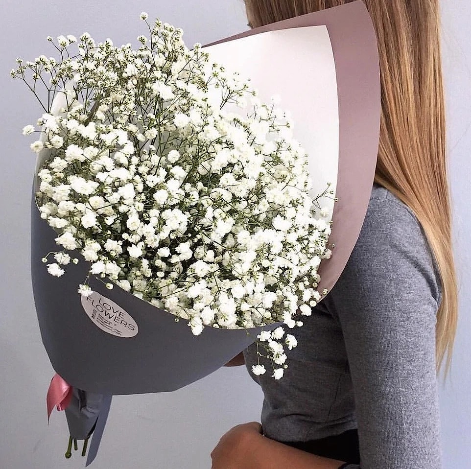 Букет из гипсофилы, сочетается с большинством цветов, но и отлично смотрится в моно-букете. Нежная и воздушная, гипсофила делает композицию праздничной и пышной. После высыхания гипсофила прекращается в сухоцвет, не теряя формы и цвета.