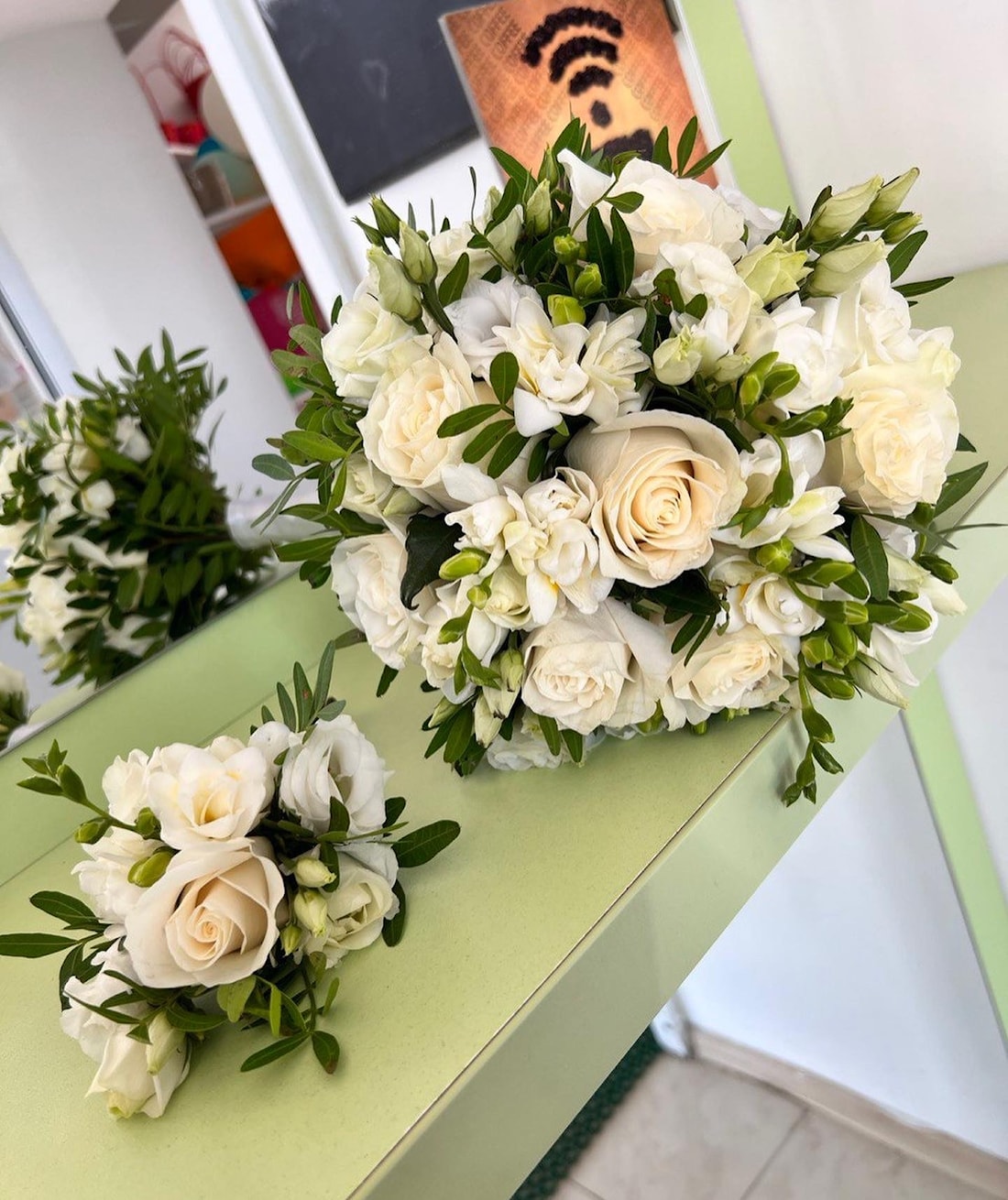 - маленький букет невесты - небольшой по размерам, состоящий из нескольких цветов с длинными стеблями. Благодаря своей «скромности» придает невесте элегантности и аккуратности;