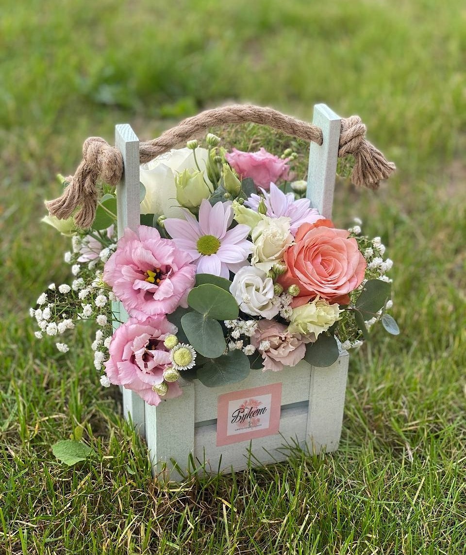 В этой нежной композиции сочетаются яркие нотки лета и холодные оттенки весны. Ящик может быть других расцветок и размеров.