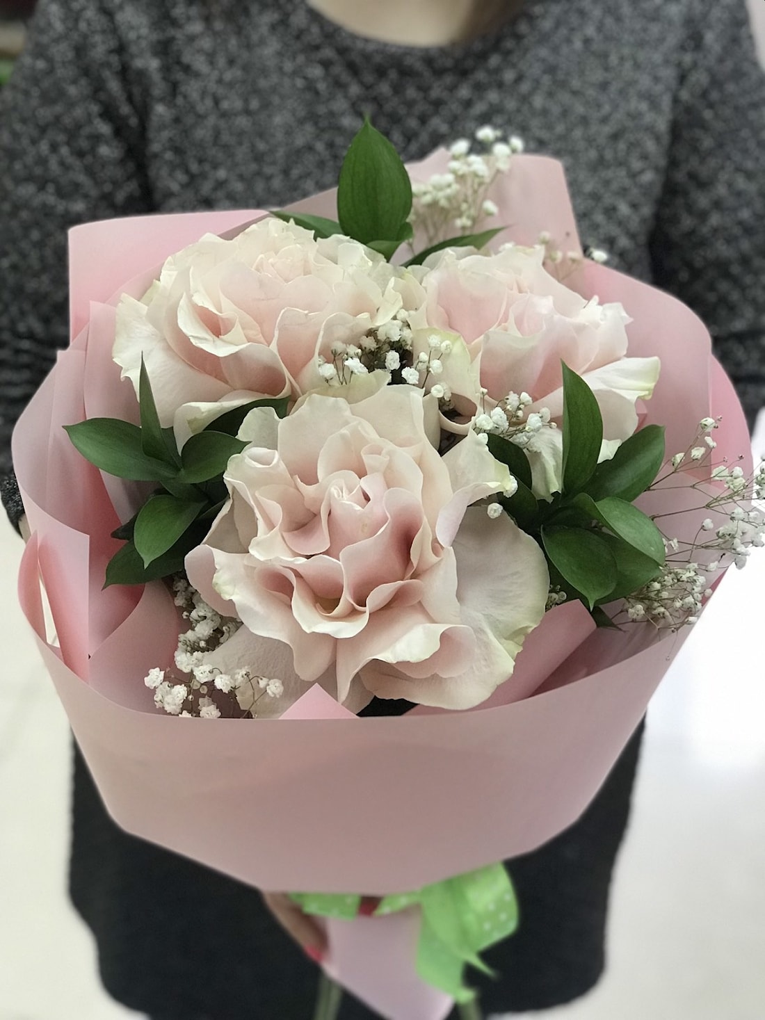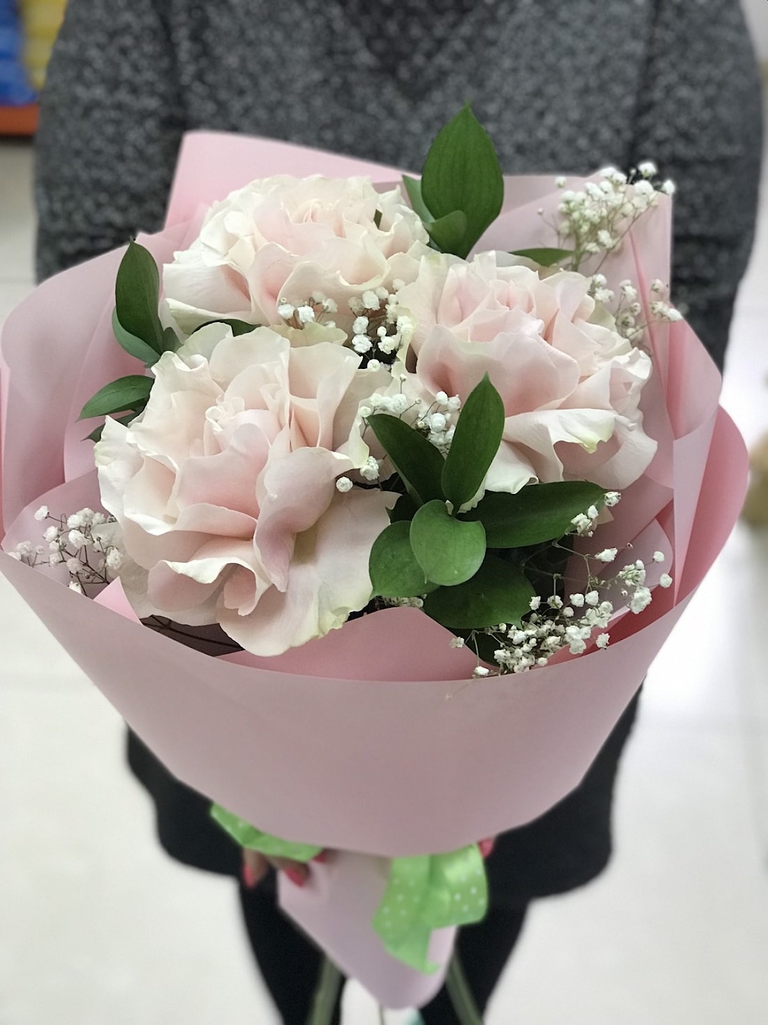 Состав букета: французские розы (3 шт), писташь (1 шт), гипсофила (1 шт)