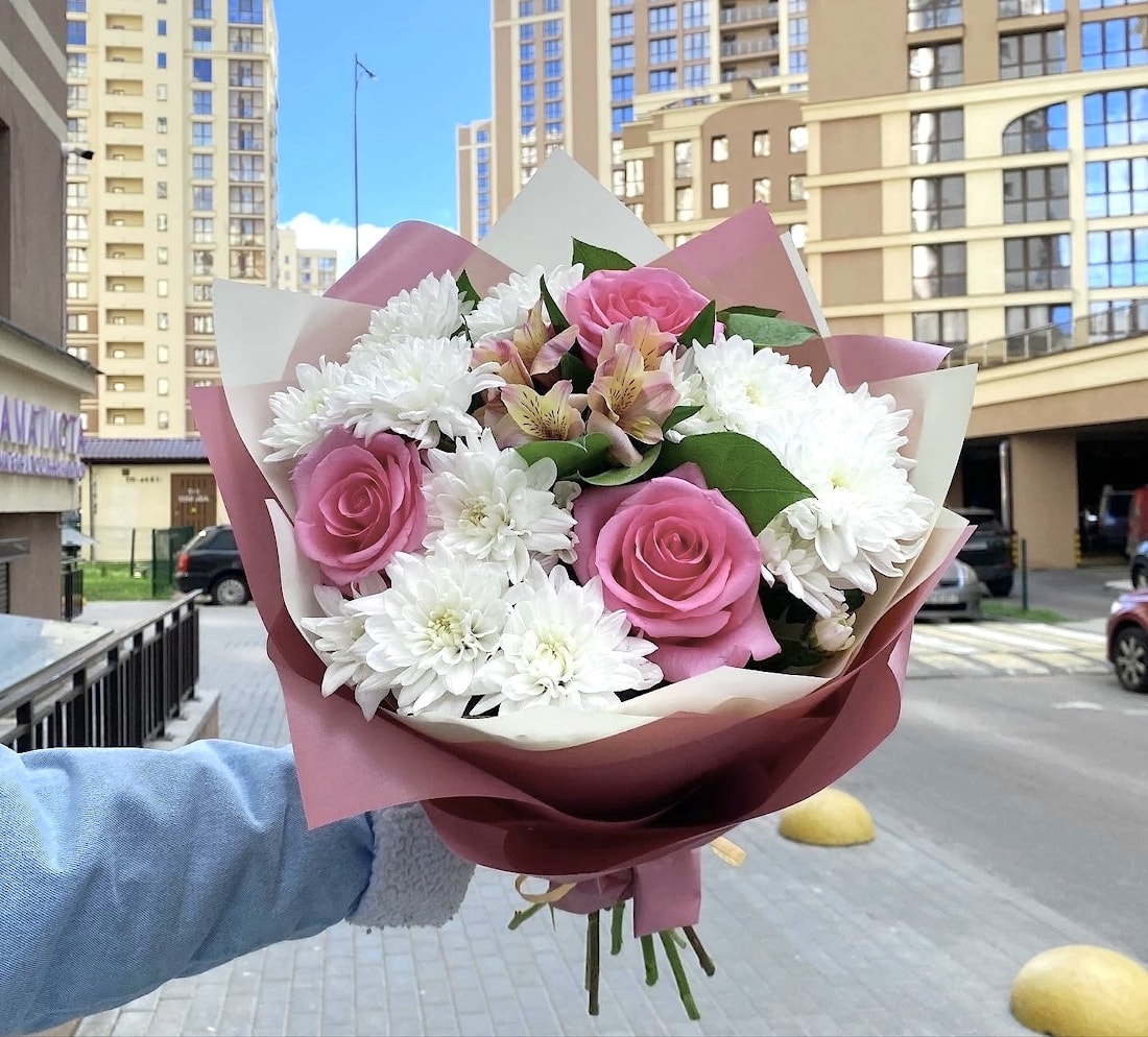 Состав: 3 яркие розы, 3 хризантемы, 1 альстромерия. Удивите ярким букетом близких и дорогих людей Цветы поднимают настроение. Возможна доставка по Минску!
