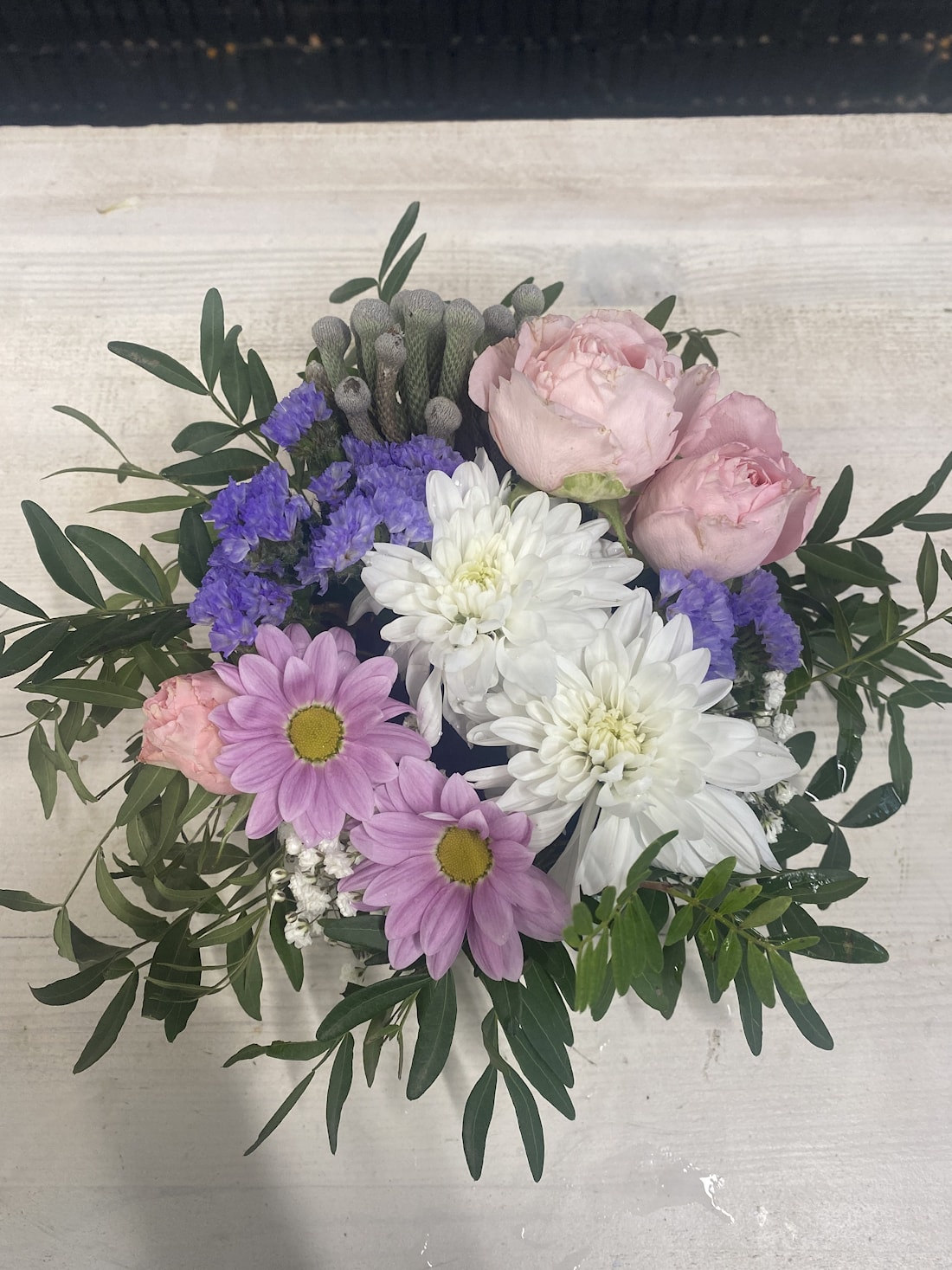 Состав: куст. роза 1 шт, зелень, гипсофила, хризантема 1 шт, бруния 1 шт, статица 1 шт