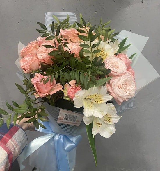 Состав: пионовидная куст. роза 4 шт, альстромерия 3 шт, зелень 4 шт
