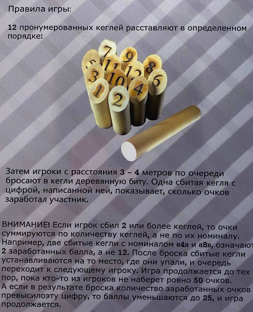 Сбита одна кегля - игроку начисляются баллы, указанные на ней. Упало 2 кегли - участник получает столько баллов, сколько сбито кегель. Три броска вхолостую, игрок выбывает. Возраст: с 3 лет