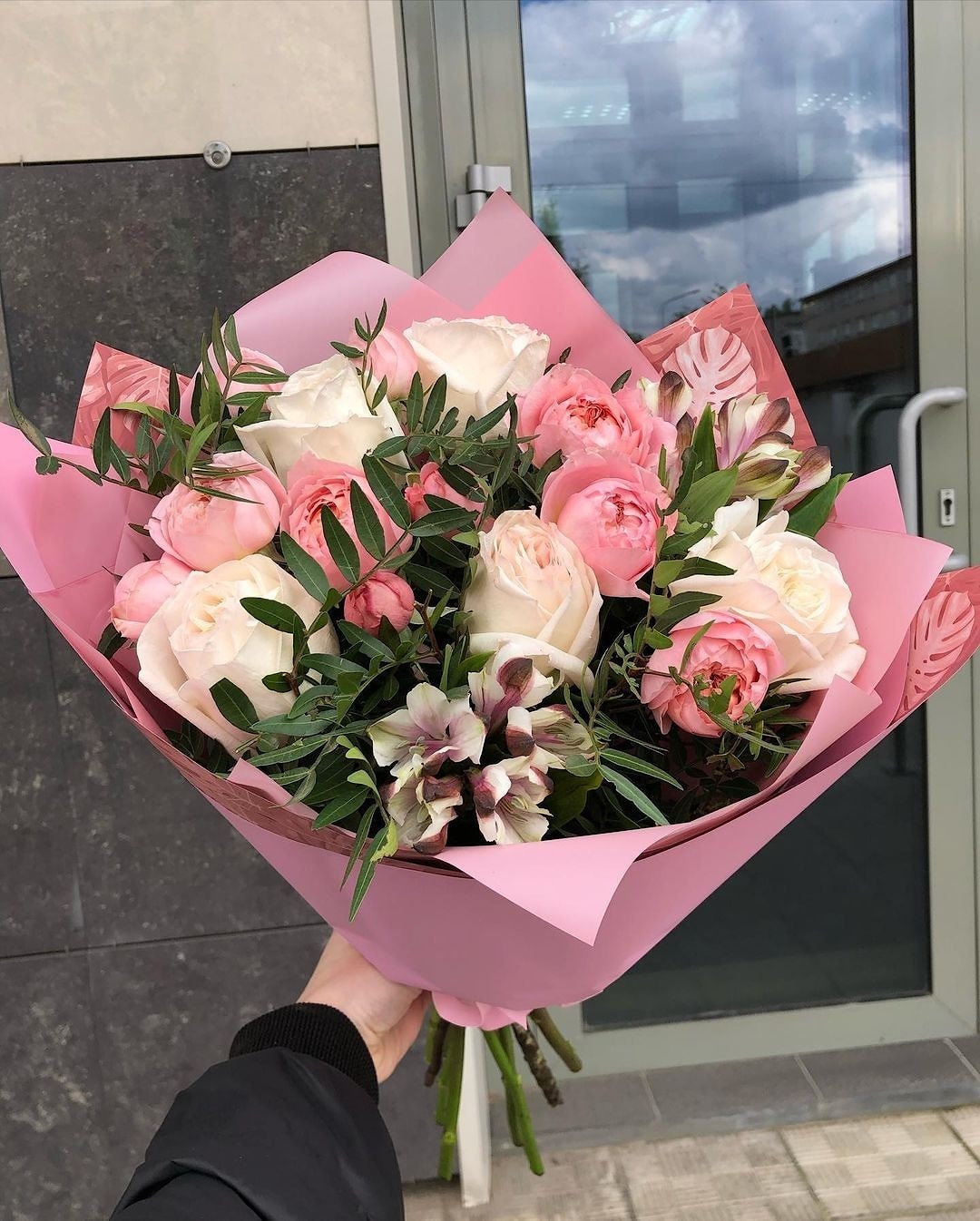 Букет №46, это стильный Букет из Кремовой, Пионовидной Розы, Альстромерии и Экзотики