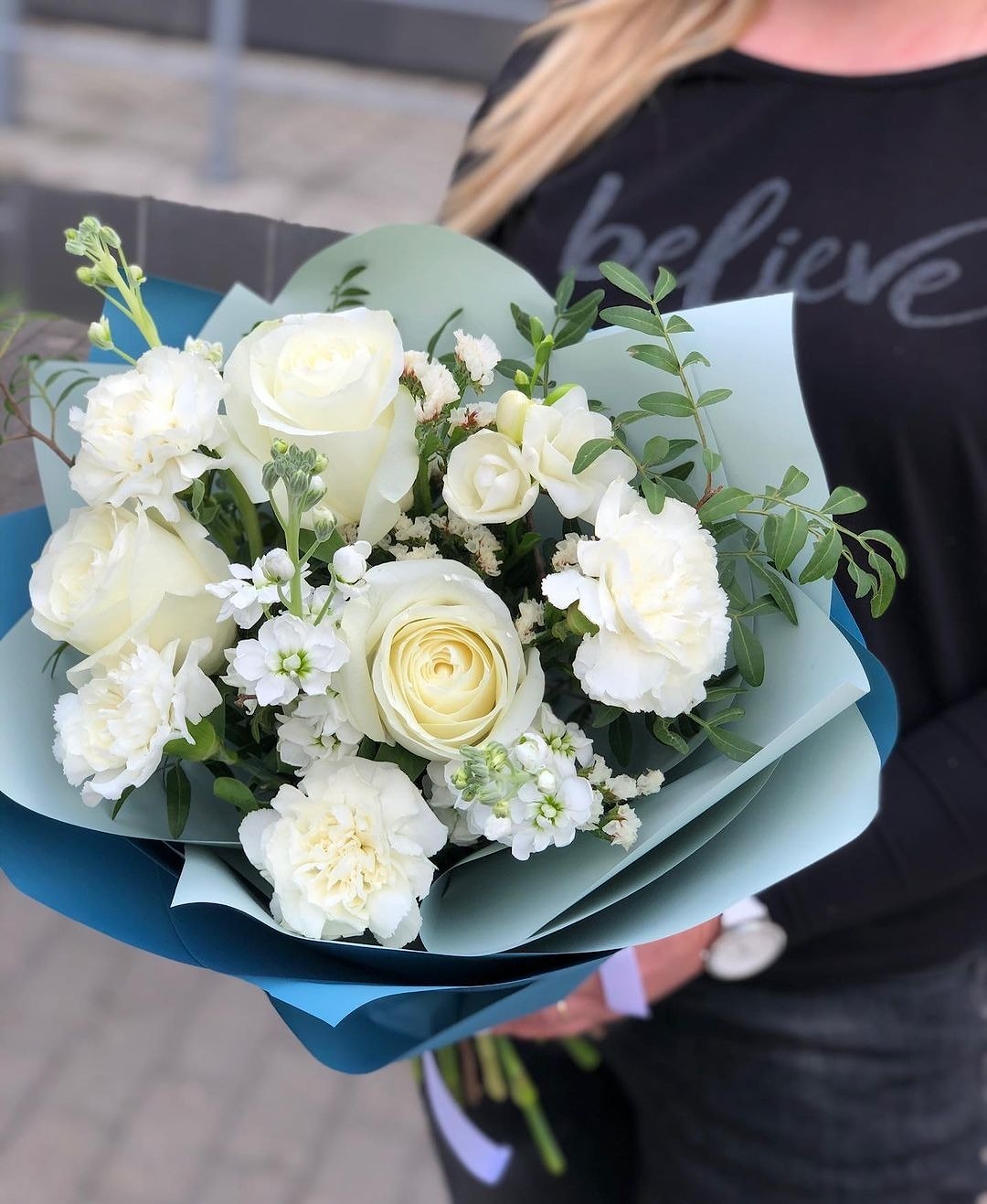 Букет №51 Модный Букет из Белой Розы и Экзотики. Которые как будто вышли из прекрасного сна, настолько красиво и гармонично выглядит этот букет.