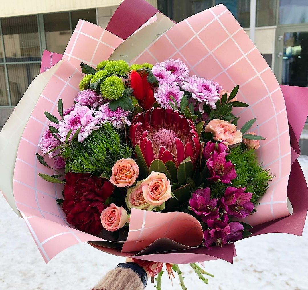 Букет №28 Модный Букет из Кремовой Кустовой Розы, Хризантемы, Альстромерии и Экзотики