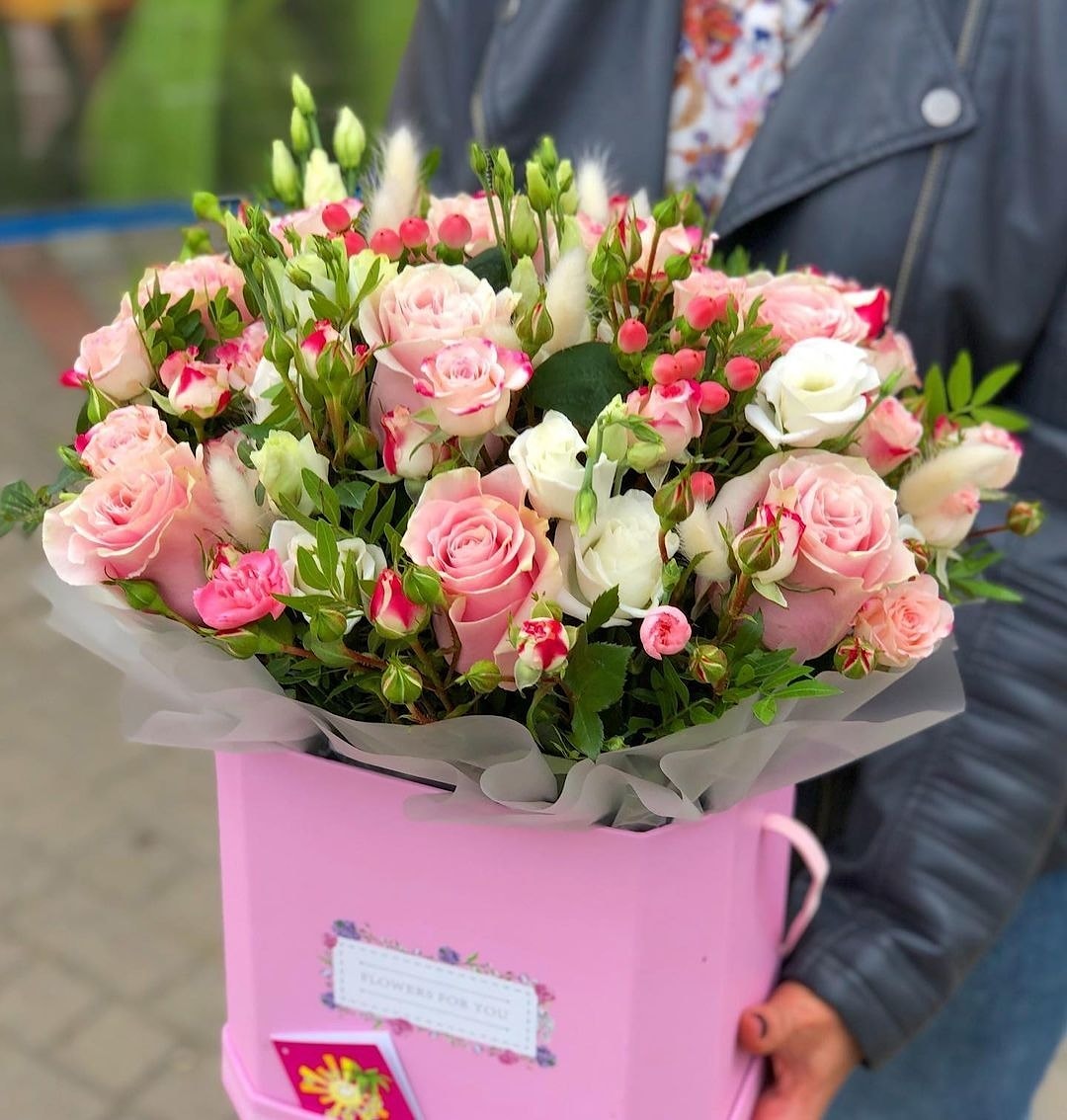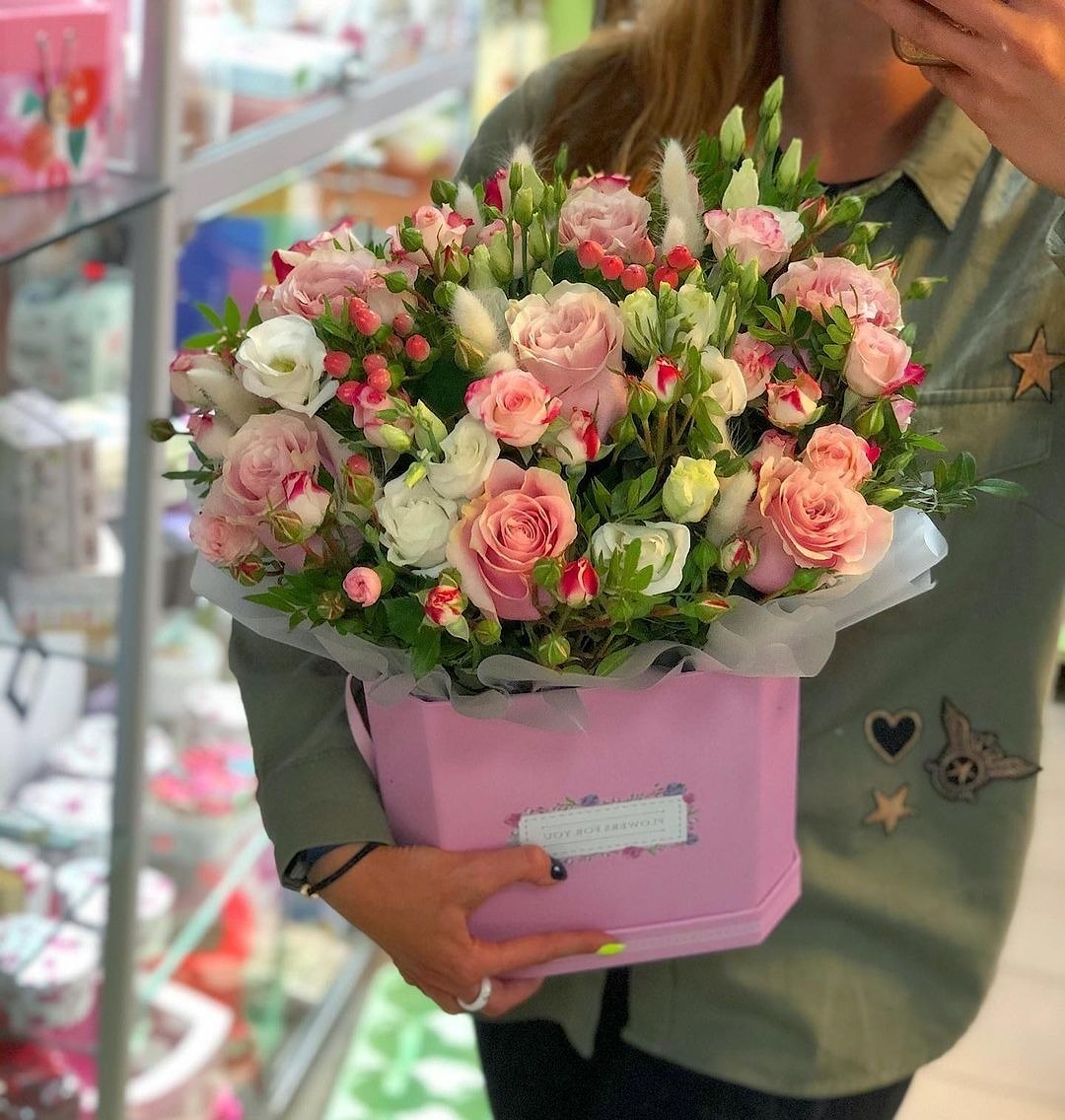 Если вы хотите купить в Минске, букет №1 Розовая коробка, Кремовые Розы, Кустовые Розы, Экзотика вы можете