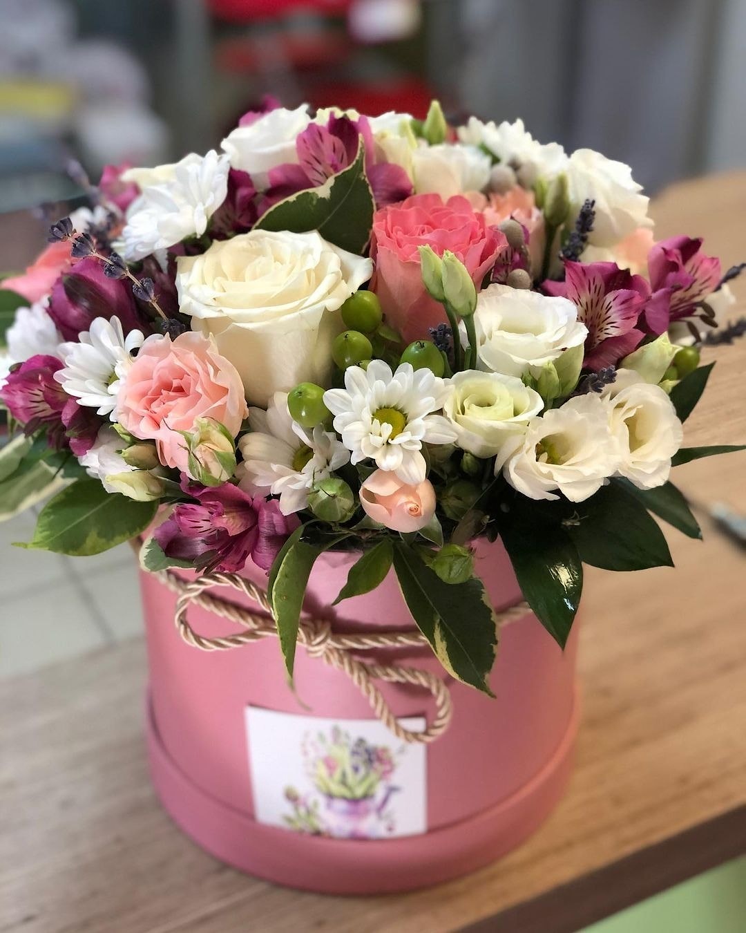 Если вы хотите купить в Минске, букет №43 Модная Коробочка с Белой и Розовой Розой, Хризантемой, Альстромерией и Экзотикой вы можете