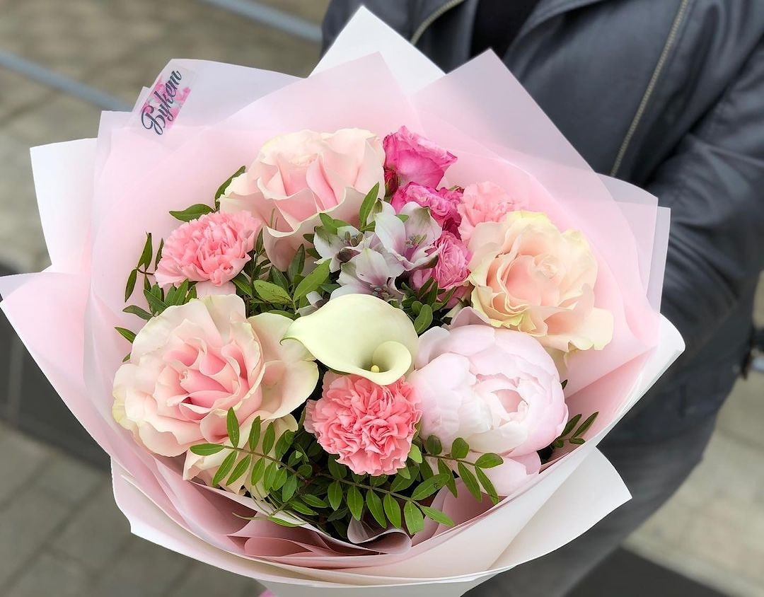 Состав: Букет из Французской Розы, Белых Калл, Розовых Гвоздик, Пионовидных Роз и Экзотики