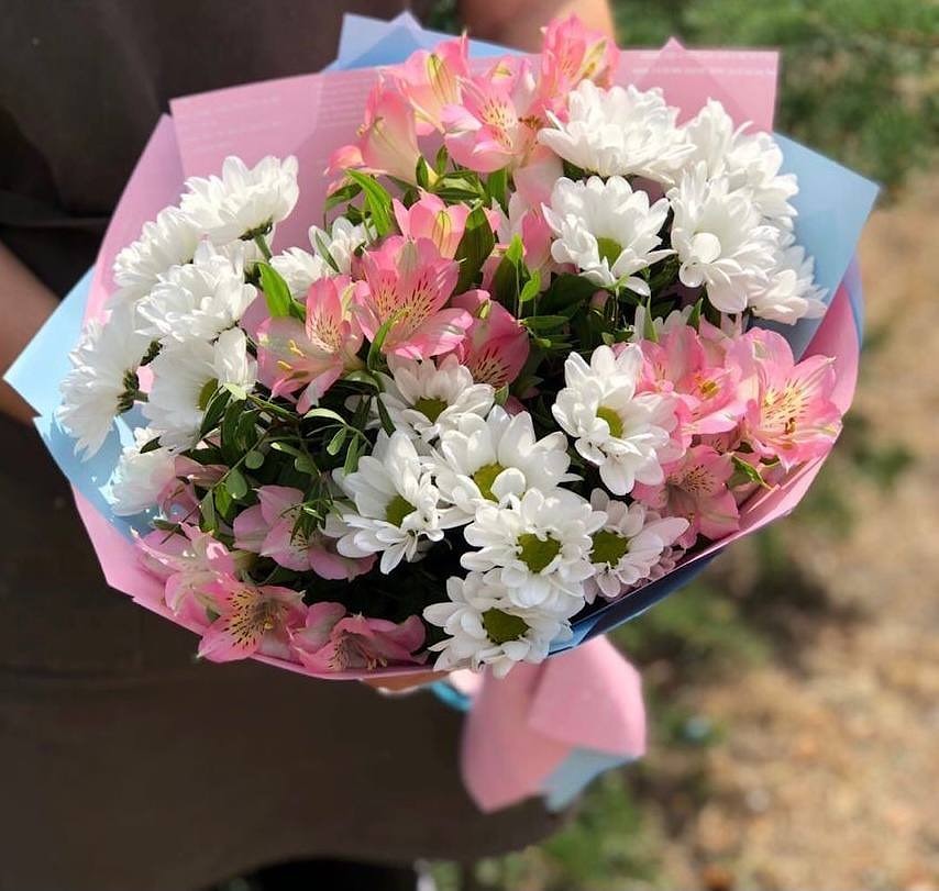 Состав: Хризантема 3 штуки, Альстромерия 4 штуки, упаковка!