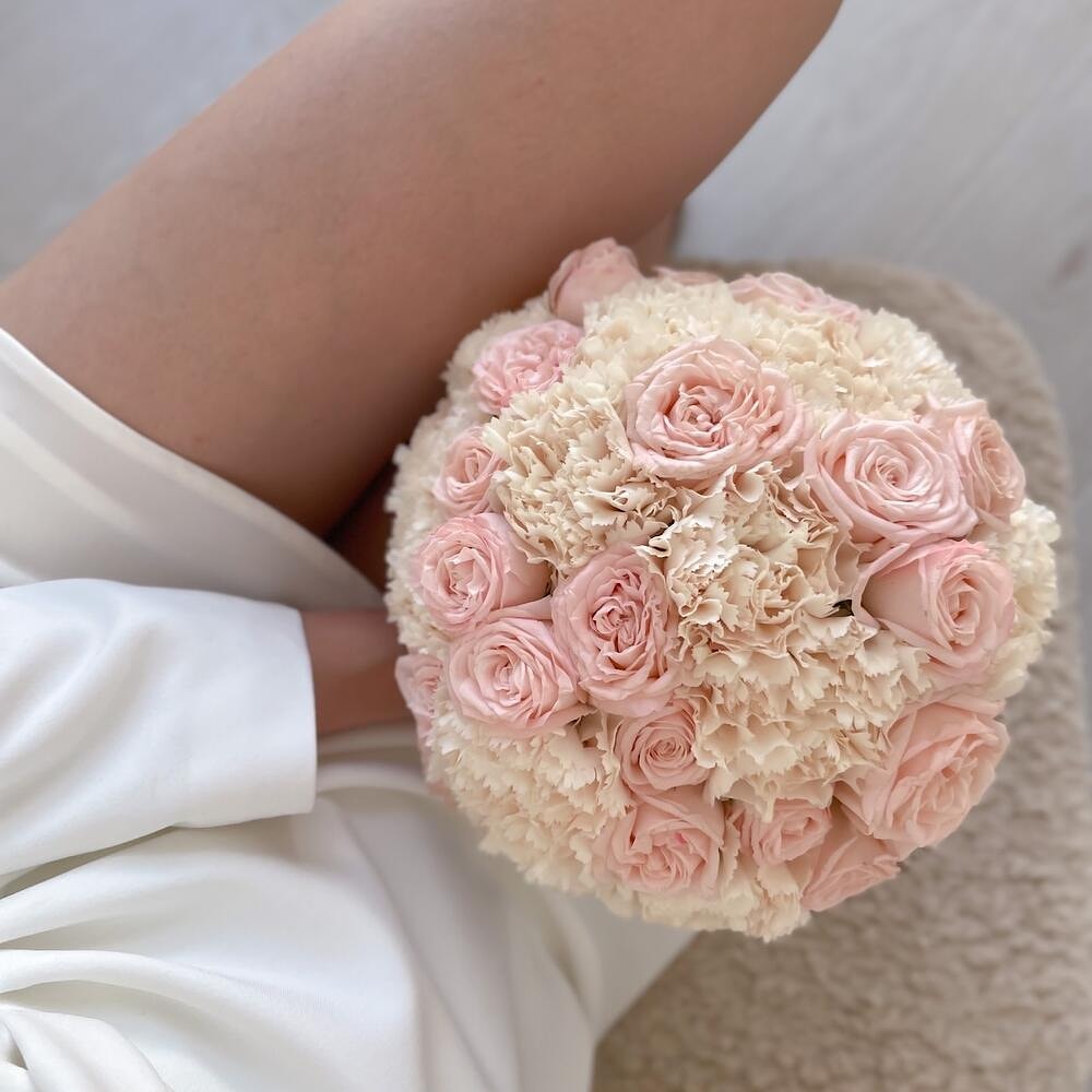 Кустовые розы Lady Bombastic славятся своими пышными цветками и нежно-розовым оттенком, символизирующим любовь, трепет и чистоту чувств. А диантусы (садовые гвоздики) добавляют легкую воздушность и текстурную глубину букету, придавая образу невесты особую свежесть и утонченность.