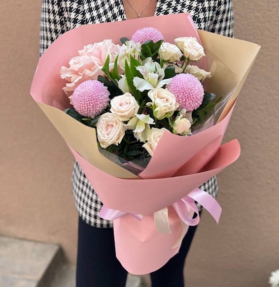 Состав: хризантема, французская роза, кустовая роза, альстромерия, зелень