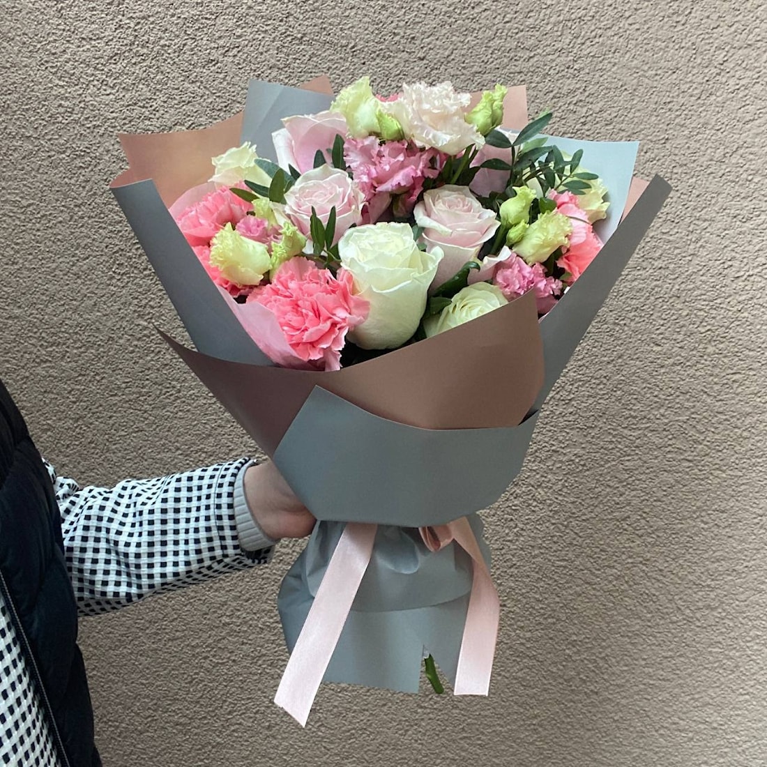 Мы рады представить наш последний шедевр, Букет № 68 "Симпатия" - потрясающую цветочную композицию, которая обязательно подарит тепло и уют вашим близким в трудную минуту. Этот изысканный букет состоит из нежных розовых и белых роз, дополненных прекрасными гвоздиками, эустомами и ароматным эвкалиптом.