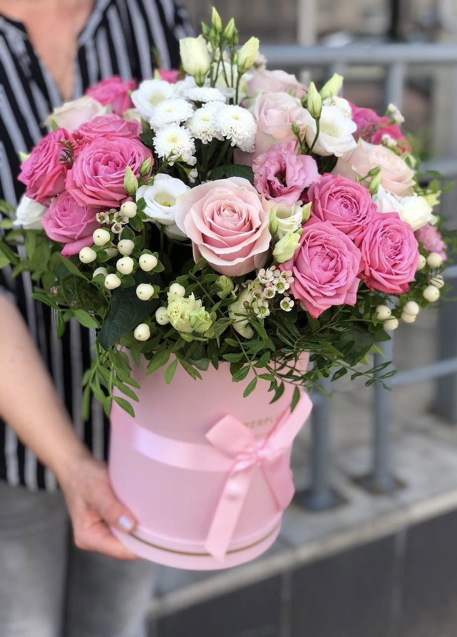 Стильная шляпная коробка, в которой представлен букет, добавляет элегантности и изысканности. Этот букет идеально подходит для любого случая, будь то романтический жест или сюрприз на день рождения.