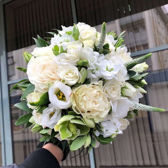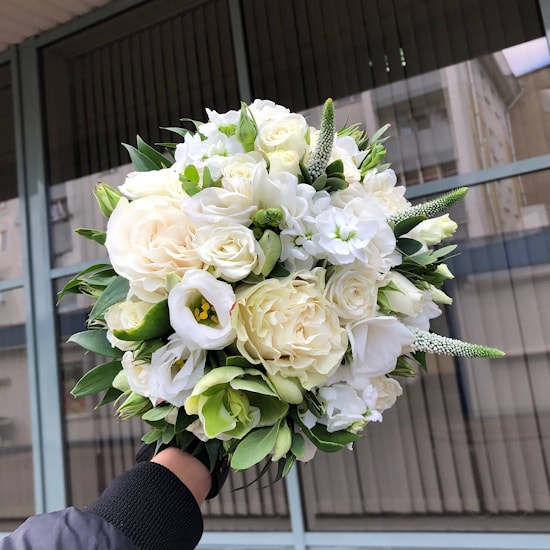 Состав свадебного букета невесты из роз: "Золотой": белые розы, маттиола, вероника, кустовая роза, эустома, зелень
