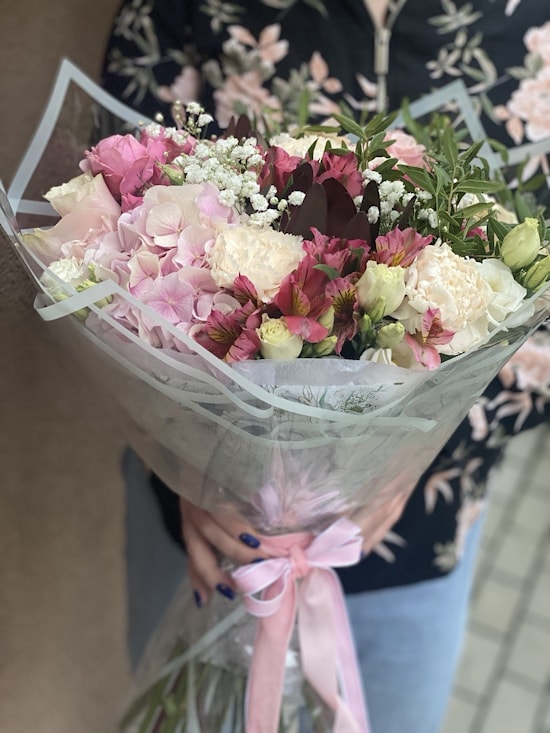Состав: роза, леукадендрон, гвоздика, альстромерия, эустома, пионовидная кустовая роза, гипсофила и зелень