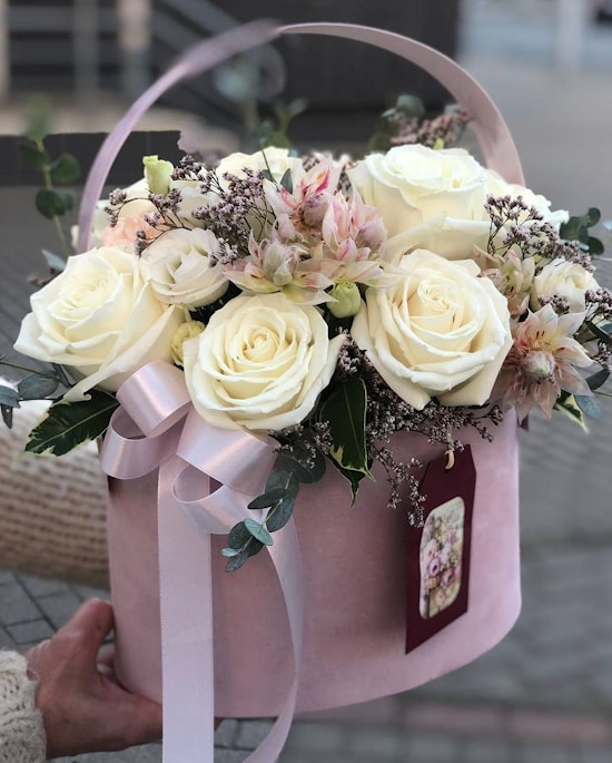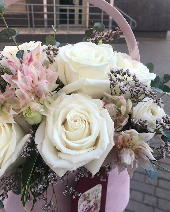 - Обворожительная, нежная эустома, долгоиграющая гвоздика, ароматный эквалипт и естественно белые розы.