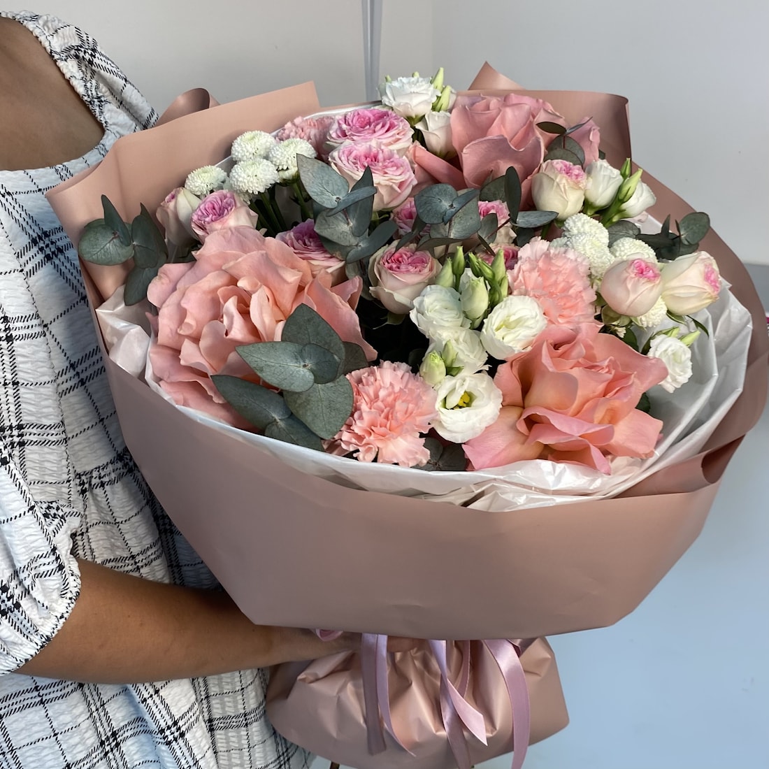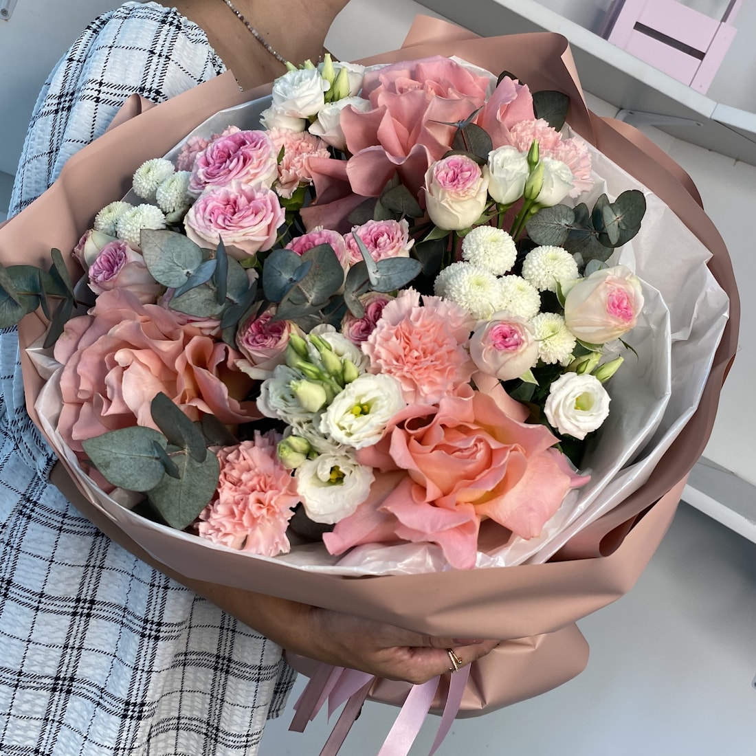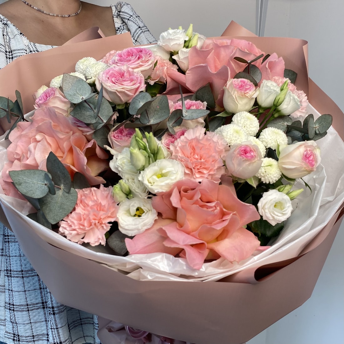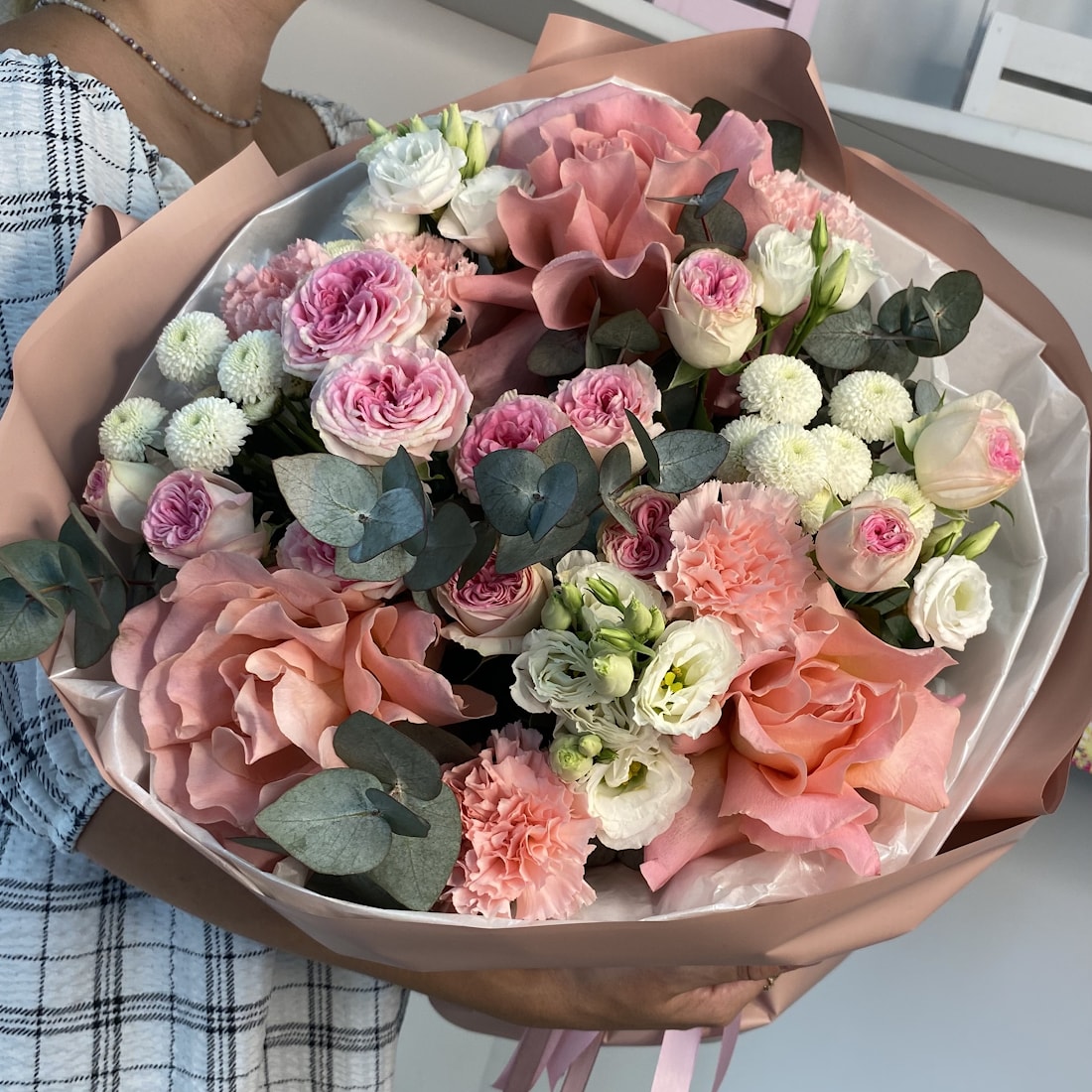 Букет «Цветочный Дождь» — это история о лёгкости, чистоте и красоте природы, словно нежный летний ливень, что освежает воздух и пробуждает эмоции. В нём собрана сама поэзия цветов: свежий эвкалипт, нежные кустовые розы, утончённые французские розы, очаровательные диантусы, воздушные эустомы и трепетные хризантемы. Всё вместе создаёт настроение свежести и гармонии — то самое чувство, когда после дождя мир кажется новым и чистым.
