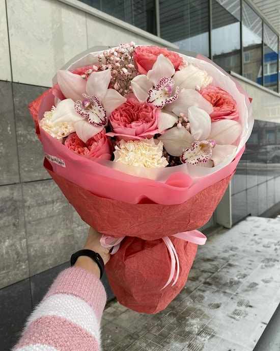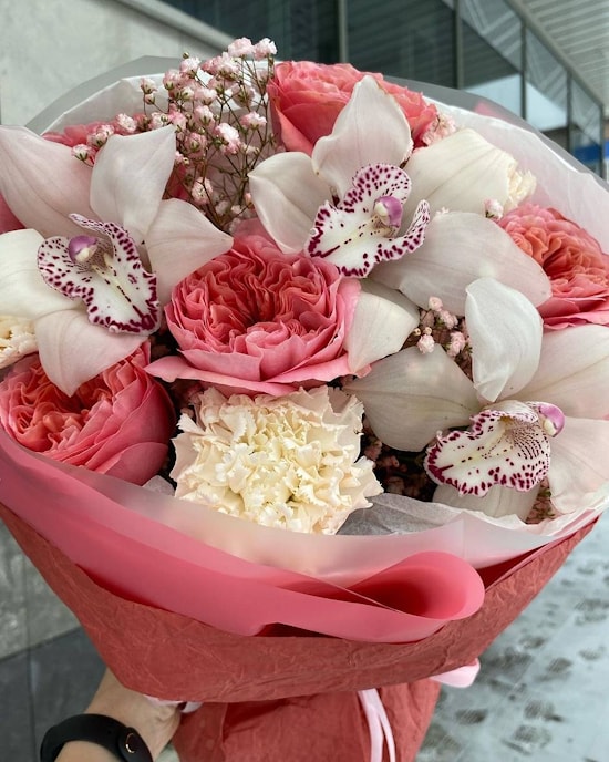 Состав: цимбидиум, пионовидная кустовая роза, гвоздика, гипсофила