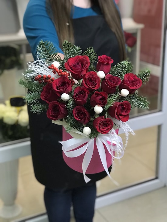 Состав Новогодней Композиции "Зеленое и Красное" : Коробка: 1 штука, Нобилис, Роза: 11-13-15 Зелень: 3