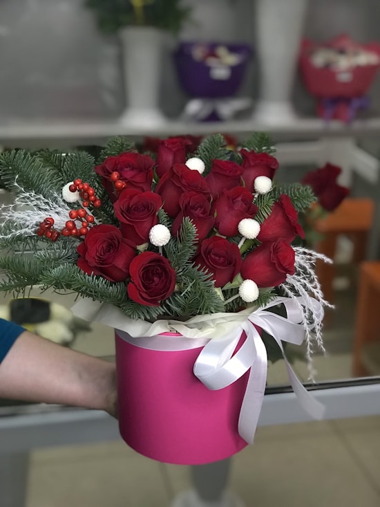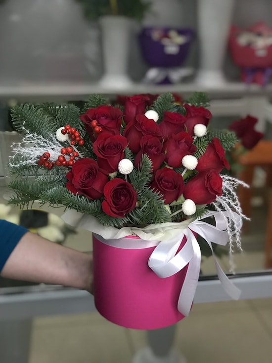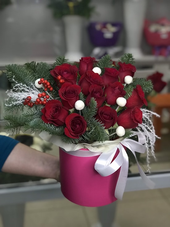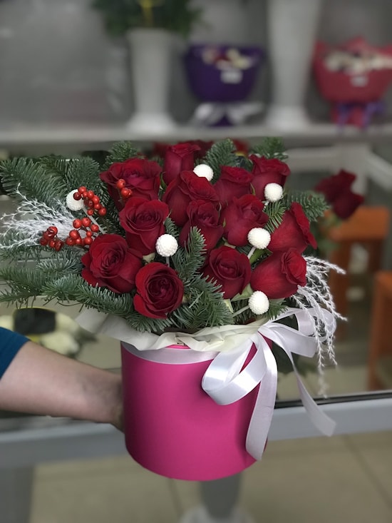 Новогодний букет в вазе, коробке, или даже кашпо – это универсальный декор, который с легкостью можно собрать и поставить там, где угодно вашей душе. Он будет уместен, как и на праздничном обеденном столе, так и за кофейным столиком в кафе, офисе.