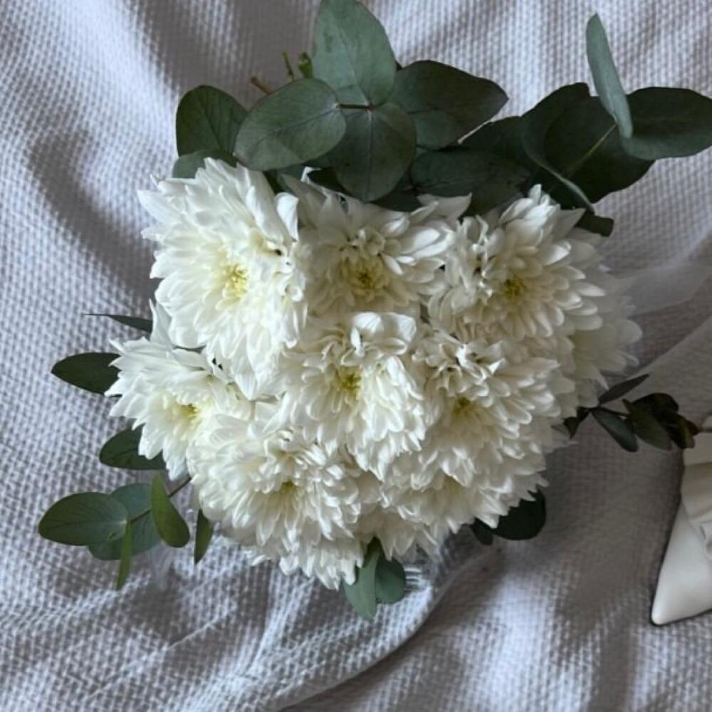 Этот свадебный букет невесты представляет собой красивое сочетание хризантем и эвкалипта . Белый цвет цветов символизирует чистоту, невинность и новые начинания. Свежий аромат и красивый внешний вид букета дополнят общую атмосферу вашего особенного дня.