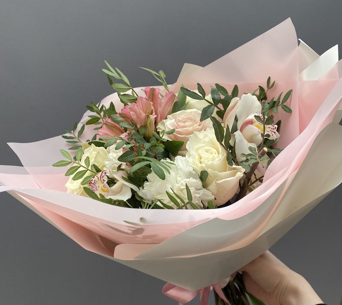 Букет "Поцелуй бабочки": цимбидиум 3шт, диантус 3шт, альстромерия 1шт, роза 5шт, писташь, упаковка дизайнерская.