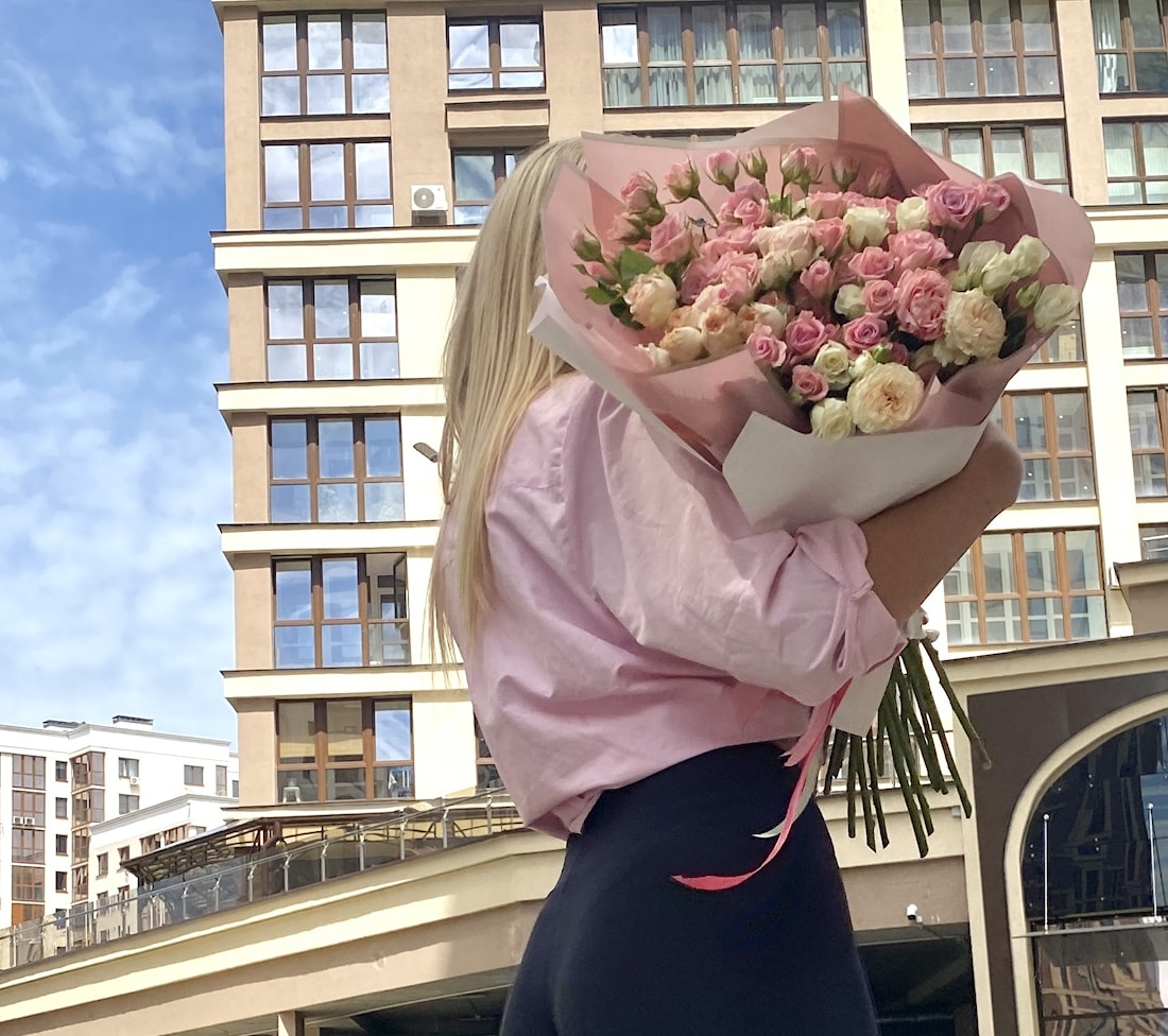 "Розовый шелк" из 21 розовой и белой кустовой нежной розы - идеальный подарок для тех, кто хочет выразить свои чувства и заботу.