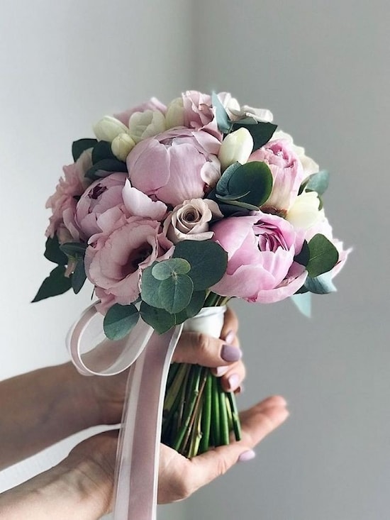 Описание: Этот свадебный букет из пионов, эустомы, фрезии и эвкалипта олицетворяет вечную красоту гармонии. Нежные пионы являются главным акцентом букета свадебных цветов, которые благодаря своей изысканности и тонкости добавляют изящества этому букету. Крупные цветы пионов на фоне нежных лепестков эустомы и фрезии создают яркое и романтическое сочетание.