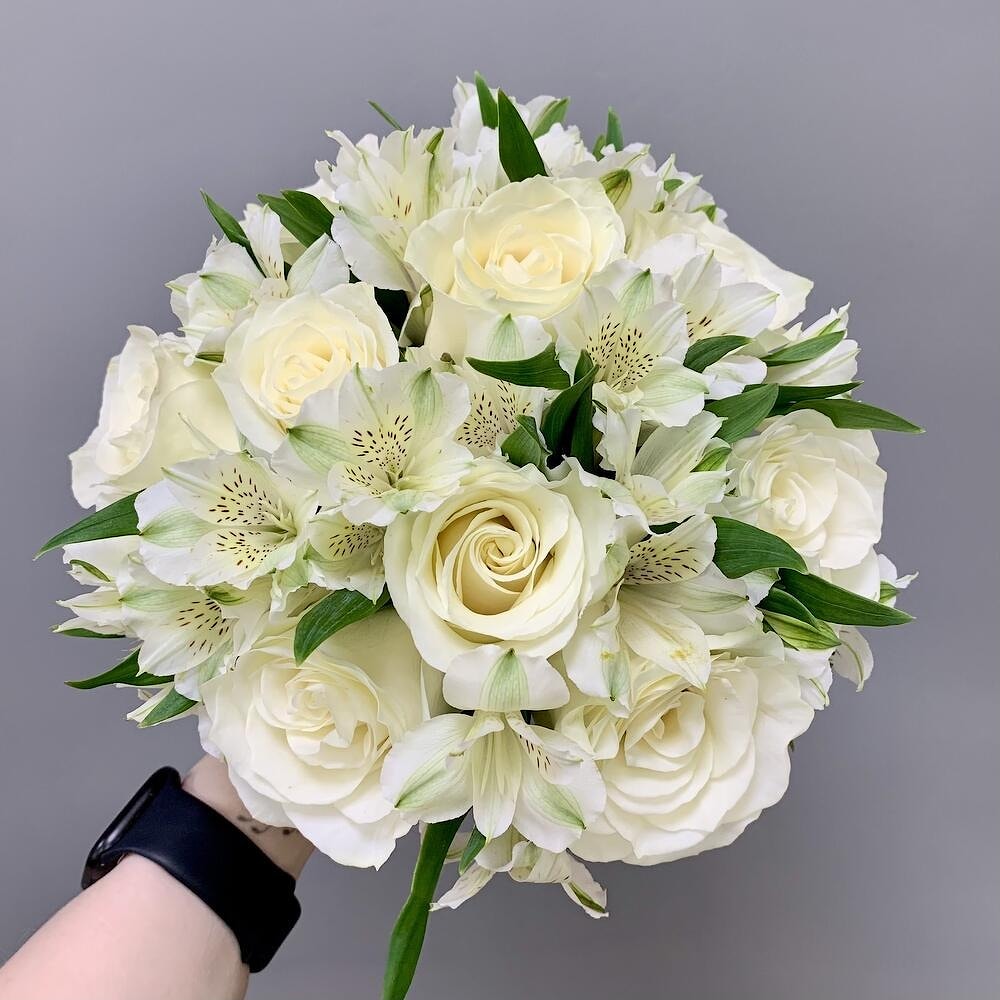 Состав: белая роза «Мондиаль»- 9 шт, белая альстромерия - 8 шт.
