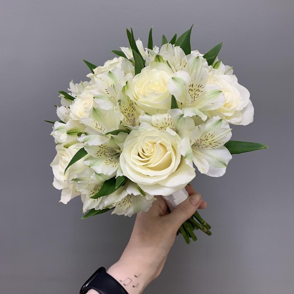 Альстромерии - цветы изящества и изумления, белые розы - символ сильной любви и привязанности, юного и чистого начала.