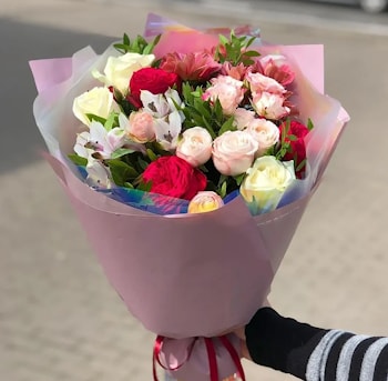 №4 - «Французский шарм» (3 француза + альстромерия) 🔥 Хит 2025 года! Новый тренд, свежий стиль. Этот букет — идеальный вариант, если хочется вау-эффекта. Букет ХИТ 3 француза, кустовая роза и альстромерия «Французский шарм» (Новая волна. Безупречный Букет 2025 года)